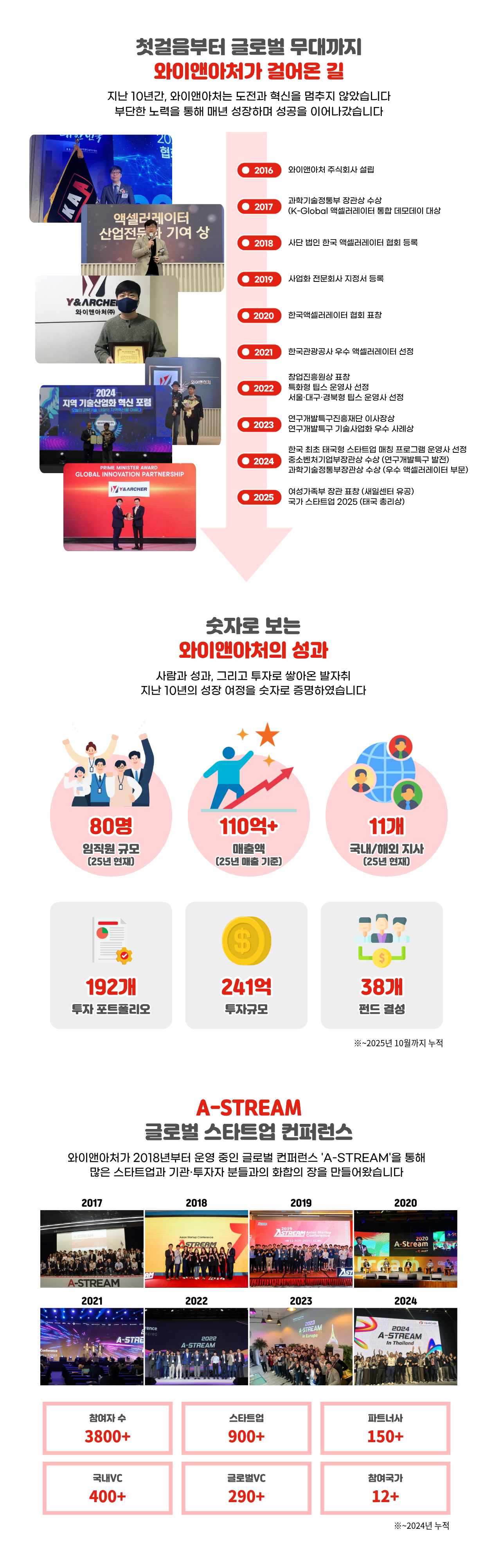 10년의 시간이 단순히 시간의 흐름이 아니라, 창업 생태계와 함께 이룬 값진 성취의 발자취이자 앞으로 나아갈 새로운 출발점이라고 생각합니다. 와이앤아처는 더 큰 꿈을 향해 도전하는 기업가들의 든든한 동반자로서, 글로벌 무대에서도 지속 가능한 성장을 만들어가겠습니다.